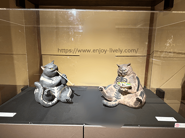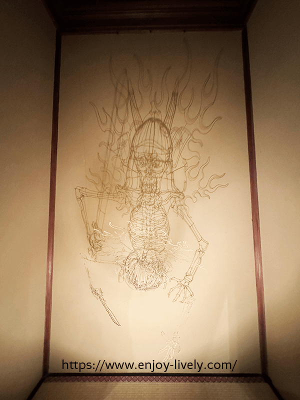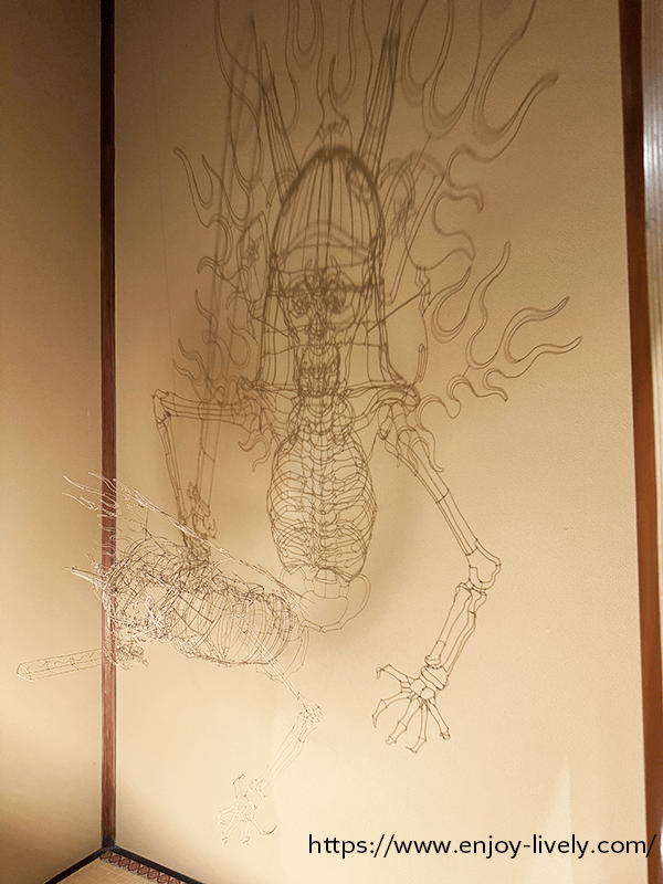 ↑この部屋の展示物で特にすごいなあと思ったのは、こちらのワイヤーアート。ライトを当てて浮かび上がる影が鬼になっています。かっこよかったです。