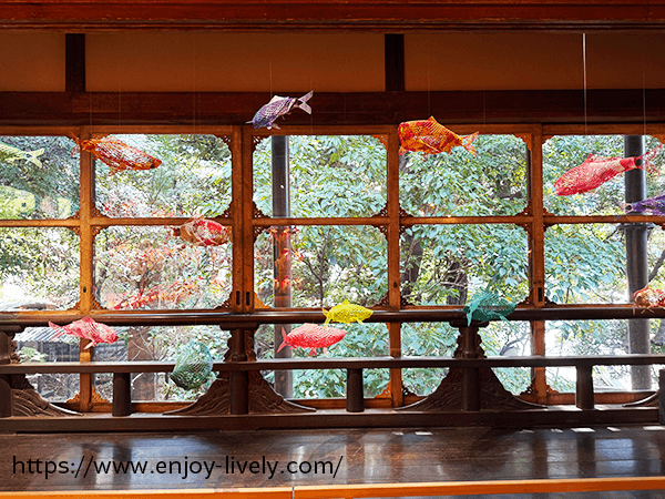 日差しをあびて金魚やにしきごいが泳ぎます。