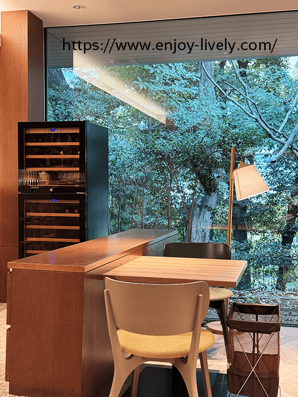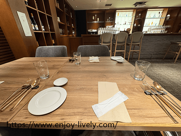 店内奥、3名でテーブルセッティングしてあるところに案内され、ちょっと、いやだいぶ気まずいあまみや。1名で占領してしまい申し訳ない…。奥にはバーカウンターのようなところがありました。