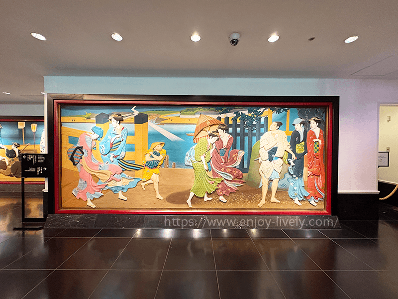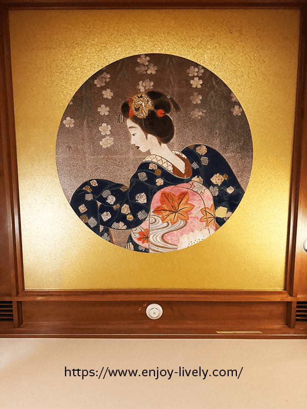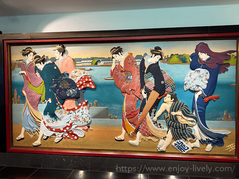回廊にそって、右手には美人画の彩色木彫板(というらしい)が飾られていました。