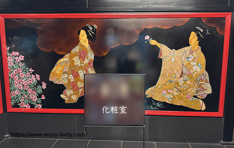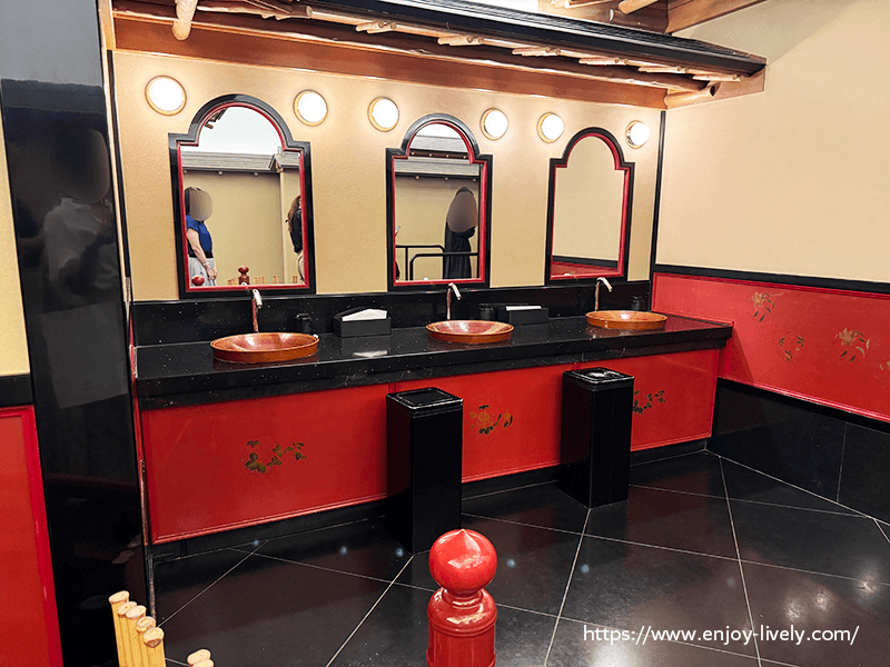 女性トイレ内に入ると、その豪華さに驚きました。トイレ待ちの列ができていたので、この待ち時間にできるだけ人の写り込みを避けつつ写真が撮れないかと要らん努力をするあまみや。