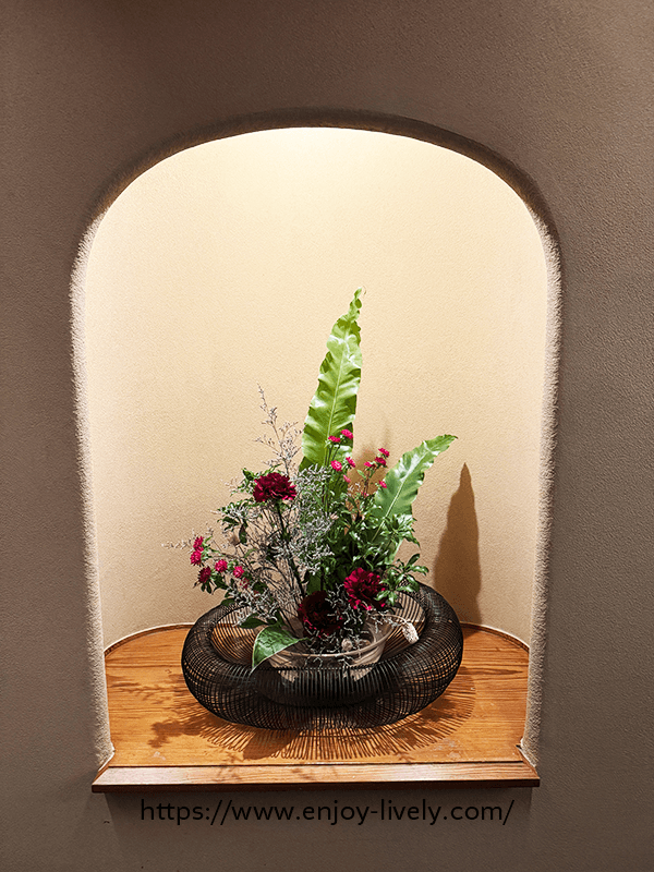 お花を持っている女の人の右側から男性トイレに入ります。女性トイレは左側から。
