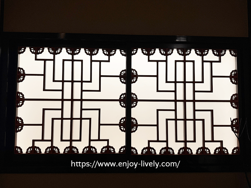 トイレの個室内は、車椅子でも入れそうなくらい広かったです。窓の模様、ずっと見てると天井を支えている人みたいに見えてくる…。