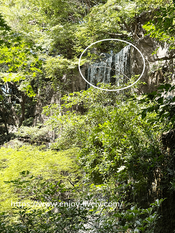 滝の裏側にも入れるようになっています。3枚目の写真は、4枚目の写真の白丸で囲んだ部分から撮影しました。
